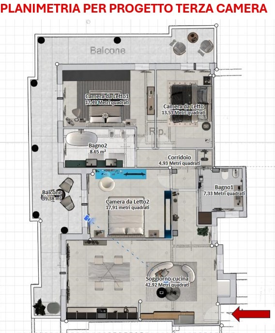 L'appartamento allo stato di fatto si presenta suddiviso come trilocale, ma vista l'ampia metratura e l'esistenza di tramezzature non portanti, si potrebbe ricavare facilmente una terza comoda camera da letto.